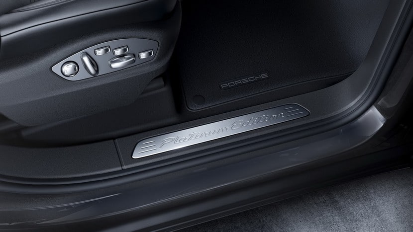 La firma alemana tampoco ha escatimado en el interior montando unos asientos deportivos con tapizado en cuero y Alcantara. Estas butacas enseñan el bordado de Porsche en el reposacabezas además de contar con hasta ocho reglajes eléctricos. El habitáculo se luce con remates específicos de esta edición especial Platinum Edition como el que encontramos nada más acceder a él, una placa de acero inoxidable en el umbral que se ilumina en el caso del Cayenne S E-Hybrid.